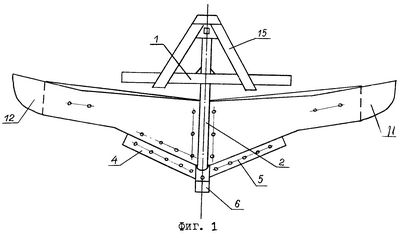 Устройство состоит из рамы 1, вертикальной стойки 2, на нижней части которой установлена пятка 3, расположенная под углом =15°…25° к горизонтальной плоскости. На пятке закреплена плоская лапа 16, выполненная с углом раствора =125°…135°, оборудованная левым и правым лемехами 4, 5 и рыхлящим устройством в виде зуба 6. К стойке и плоскости лапы прикреплены левый и правый отвалы, выполненные с цилиндрическими поверхностями 7 и 8, оборудованные лыжами 9, 10. На концах отвалов выполнены полувинтовые открылки 11 и 12. Стойка может быть оборудована регулировочным винтом 13 для поворота ее в вертикальной плоскости вокруг оси 14, рама снабжена автосцепкой 15.