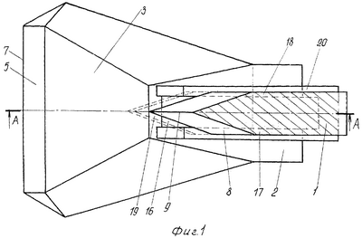Величины двугранных углов а в корпусе 2 между лобовой гранью 10 и тыльной гранью 11, левой 12 и правой 13 гранями и тыльной гранью 11, левой 14 и правой 15 наклонными угловыми гранями и тыльной гранью 11 выполнены равновеликими и не превышают 30°. Корпус 2 снабжен продольным пазом 16. Продольный паз 16 сопряжен с направляющей штангой 1. Продольный паз 16 сопряжен с направляющей штангой 1 посредством прорезей 17 и 18 на боковых гранях штанги 1 и канавкой 19 на двугранном лезвии 8. Направляющая штанга 1 зафиксирована на корпусе 2 рыхлителя фиксатором 20 в виде П-образной пластины. Пластина фиксатора 20 размещена над корпусом 2 в прорезях 17 и 18 на боковых гранях штанги 1. Таким образом, корпус 2 в рабочем положении блокируют на нижней части направляющей штанги 1. Материал направляющей штанги 1 – Сталь 20 по ГОСТ 1050-88 (см. фиг.1-3).