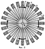 Известен способ ориентирования изделий различной формы при их транспортировании (см. заявку №2001121959 от 07.08.2001 г.), согласно которому формируют строчные последовательности изделий в плоскости вращения с последующим переносом их на общий носитель элементом переноса, при этом вводят дополнительные элементы переноса изделий, образуя совокупность элементов переноса изделий, которые располагают либо в радиальных направлениях, либо в смещенных радиальных направлениях, причем ось вращения совокупности элементов переноса изделий располагают либо компланарно оси вращения одной или двум плоскостям формирования строчной последовательности изделий, либо соосно, над которой или которыми располагают совокупность элементов переноса изделий, при этом общий носитель располагают с возможностью непрерывного или дискретного смещения под сформированной совокупностью элементов переноса изделий и на него осуществляют перенос и фиксацию строчных последовательностей изделий с соответствующих элементов переноса изделий. При этом элемент переноса строчной последовательности изделий со стороны приема строчной последовательности выполняют со смачиваемой поверхностью (прототип).