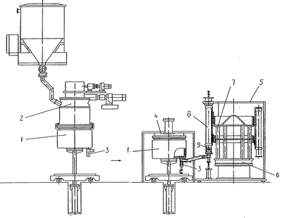 На чертеже изображена схема формования изделия из взрывчатого состава по предлагаемому способу. На схеме цифрами обозначены: корпус смесителя 1, головка смесительная 2, затвор смесителя 3, поршневая гидравлическая система вытеснения 4, установка дистанционного заполнения 5, стол поворотный 6, барабан 7, пресс-форма 8, отсекатель пресс-формы 9.
