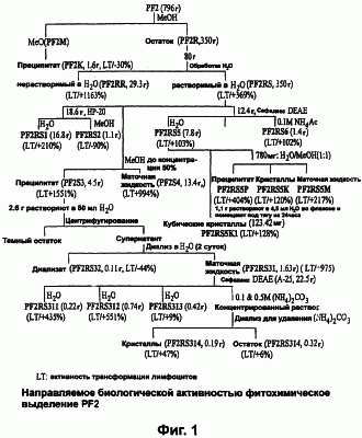 Таким образом, лиофилизуют 112 л полученного предварительно водного экстракта и получают 800 г желтовато-коричневого порошка (“PF2”). Полученный порошок фракционируют на фракцию, растворимую в МеОН, и остаток, нерастворимый в MeOH (PF2R, 350 г), который обнаруживает активность трансформации лейкоцитов. Часть (80 г) такого материала подвергают осаждению MeOH, центрифугированию, диализу и/или колоночной хроматографии на сефадексе DEAE, что ведет к выделению нескольких кристаллических веществ, которые определяют как неактивные неорганические соли (фигура 1).
