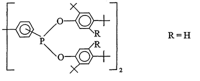 Также в соответствии с тем, как это используется в настоящем документе, термин «фосфорсодержащий вторичный антиоксидант» обозначает соединения, которые представляют собой вещества, вызывающие разложение гидроперекисей, то есть соединения, обладающие способностью вступать в реакцию с гидроперекисями с получением нерадикальных продуктов, в особенности те, которые вызывают разложение гидроперекисей с получением устойчивых побочных продуктов. Примерами таких соединений являются сложные триэфиры фосфорной кислоты (фосфиты) и сложные диэфиры фосфорной кислоты (фосфониты).