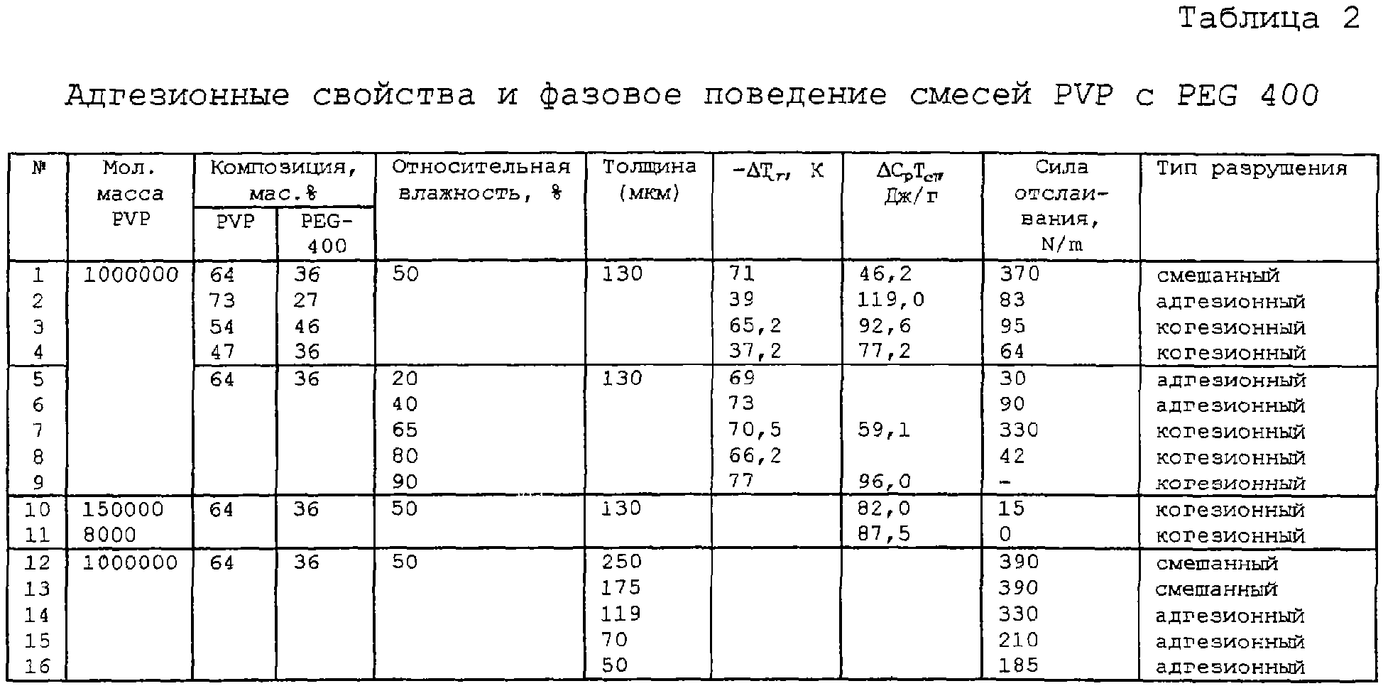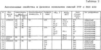 На фиг.2 показан график, иллюстрирующий характеристики адгезии смеси PVP-PEG (поливинилпирролидон-полиэтиленгликоля) (молекулярная масса 400 г/моль), полученные при приложении силы отслаивания под углом 180°, необходимого для разрушения адгезионного соединения с полиэтиленовым (РЕ) субстратом при скорости отслаивания 10 мм/мин, а также изменения температуры стеклования, Тg, смеси. Точки обозначают экспериментальные данные, и линия, соединяющая значения Тg для PVP и PEG-400, получена при помощи уравнения Фокса.