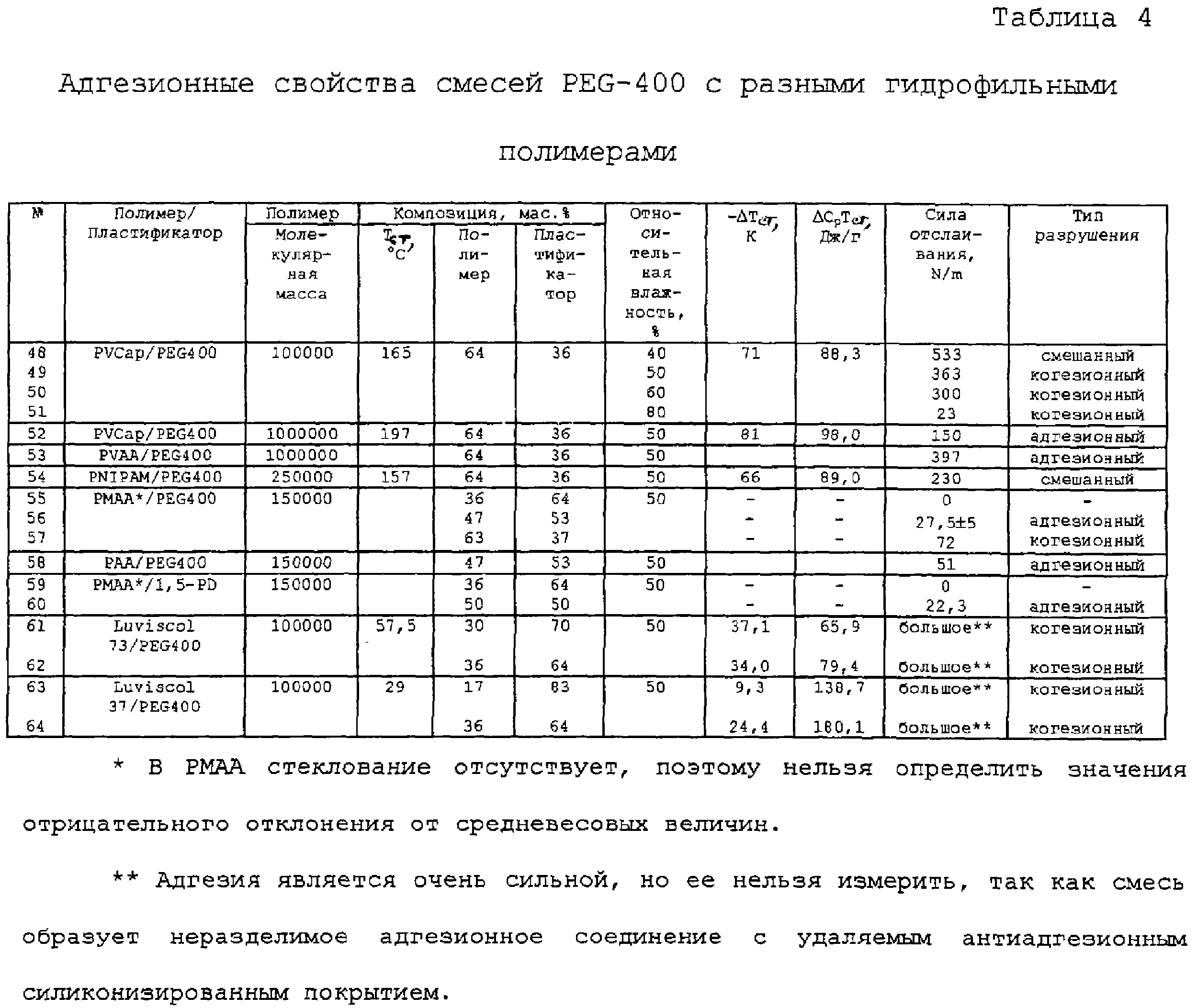 На фиг.4 показаны результаты влияния соотношения гидрофильного полимера и пластификатора, а также относительной влажности окружающей среды на адгезию PVP, пластифицированного PEG-400, полученные при приложении силы отслаивания под углом 180°.