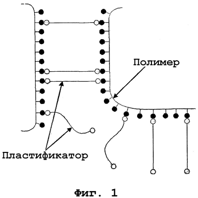 На фиг.1 дано схематическое изображение молекулярной структуры сшитого комплекса с водородными или электростатическими связями, который образован длинноцепным гидрофильным полимером и короткоцепным пластификатором.