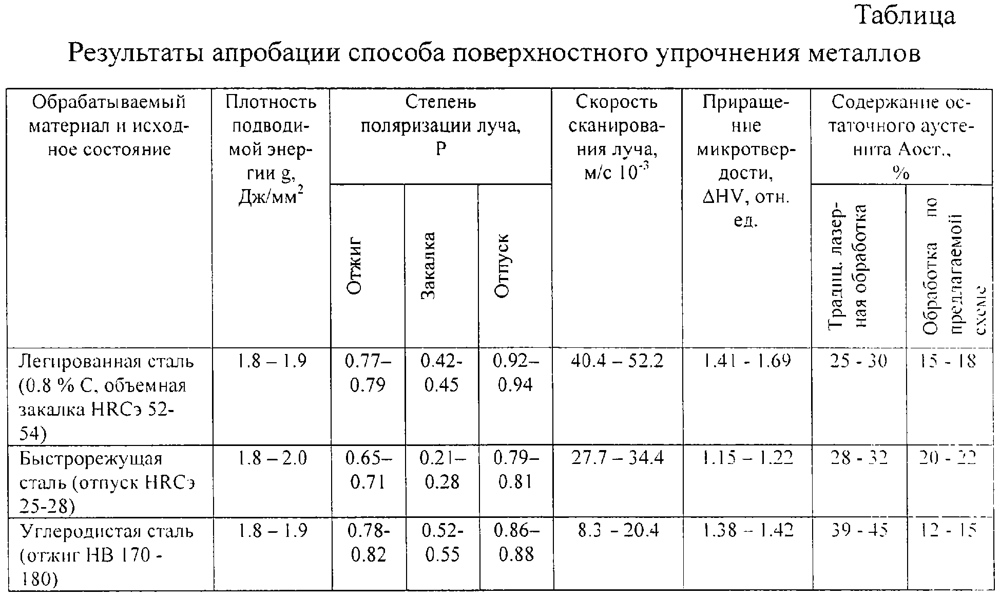 Это достигается тем, что в способе поверхностного упрочнения металлов путем изменения уровня теплового воздействия на обрабатываемую поверхность, включающем локальную закалку сканирующим лазерным лучом, производят поляризацию лазерного луча в полосу с переменной интенсивностью излучения и сканируют вдоль этой полосы, при этом степень поляризации устанавливают согласно принятым условиям теплового воздействия с учетом фиксированной скорости сканирования и последовательно реализуют стадии изотермической выдержки обрабатываемого участка на различных температурных уровнях, а изменение температуры осуществляют с оптимальными для упрочняемого металла скоростями. При этом скорость сканирования назначают экспериментально по величине заданной микротвердости в упрочненных слоях металла, соответствующей закалочному состоянию.