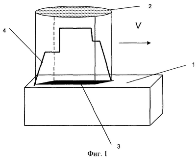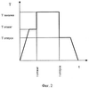 На фиг.1 приведена схема обработки, на фиг.2 – зависимость температуры Т на элементе обрабатываемой поверхности от времени t.