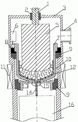 При вращении кристаллизатора 7 и плавлении электрода 5 образуется ванна расплава 12, сферически развернутая вокруг переплавляемого электрода 5 и образующая, соприкасаясь с медным охлаждаемым кристаллизатором 7, гарнисаж, в который вмораживаются, под действием центробежных сил, тяжелые нерастворимые включения. Высота кристаллизатора 7 определяется высотой развернутой ванны расплава 12 и зависит от скорости вращения кристаллизатора. Через патрубок 4 происходит откачка вакуума и летучих примесей с большой эффективностью, так как зона плавления в данном случае постоянна и находится очень близко от патрубка, а развернутая поверхность расплава позволяет очень быстро освобождаться от летучих примесей. Сливное отверстие 15 подбирается определенного диаметра, так чтобы через него мог образоваться безразрывный поток металла 14, зависящий от скорости плавления и частоты вращения. Далее полученный безразрывный поток 14, обогреваемый электродугой 13, сверху устремляется в зону кристаллизации 16, в которой может быть размещен скользящий кристаллизатор, валки или формы.