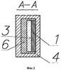 на фиг.2 – разрез А-А на фиг.1: 1 – полоса листового материала, 3 – расплав материала, 4 – кристаллизатор, 6 – графитовая вставка;