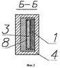 на фиг.3 – разрез Б-Б на фиг.1: 1 – полоса листового материала, 3 – расплав материала, 4 – кристаллизатор, 8 – закристаллизовавшаяся оболочка;