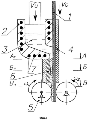 на фиг.1 – изображено устройство для непрерывного нанесения металлопокрытия на листовой металл: 1 – полоса листового материала, 2 – раздаточное устройство, 3 – расплав материала, 4 – кристаллизатор, 5 – прокатные валки, 6 – графитовая вставка, 7 – нагревательные элементы;