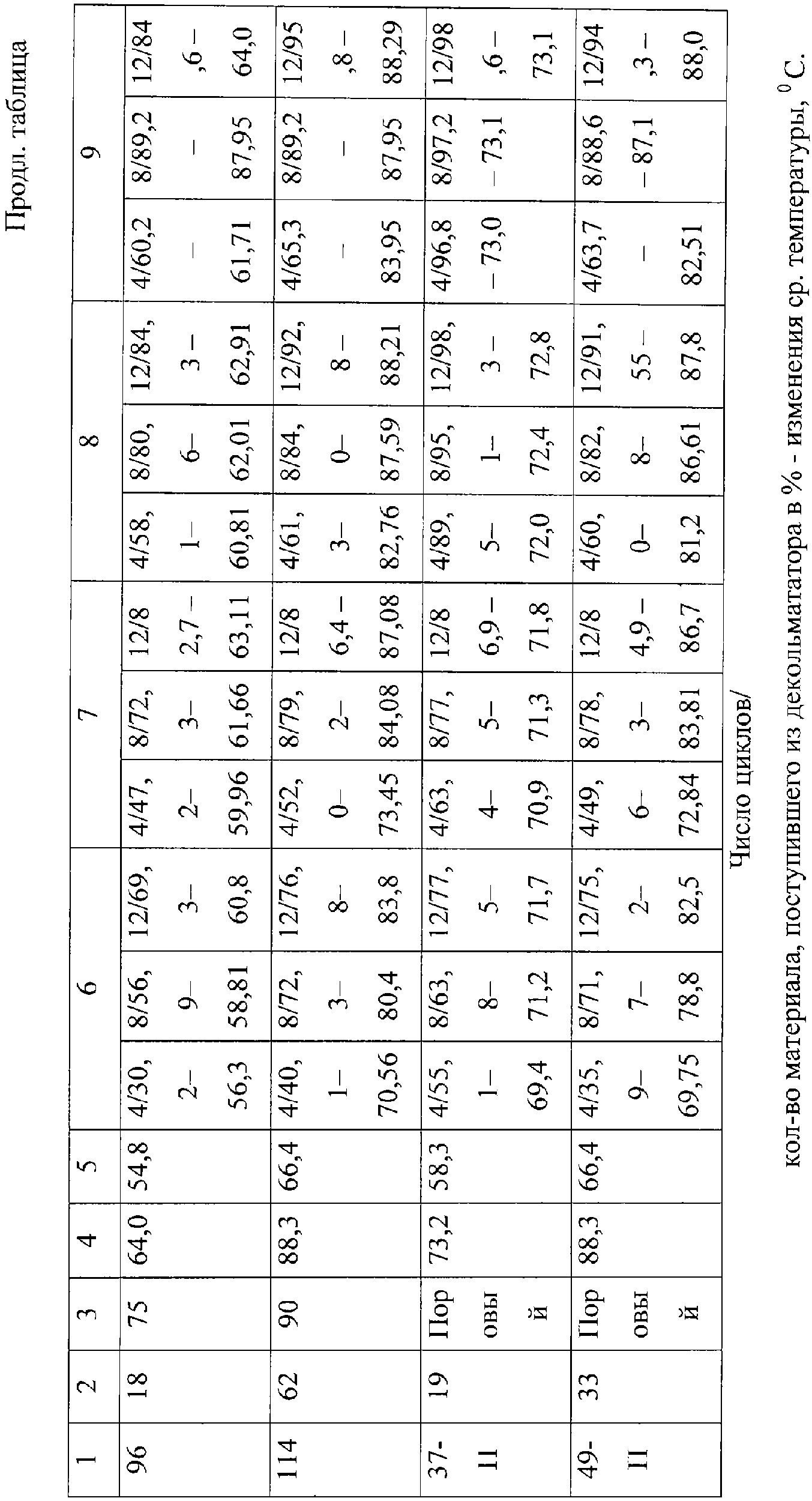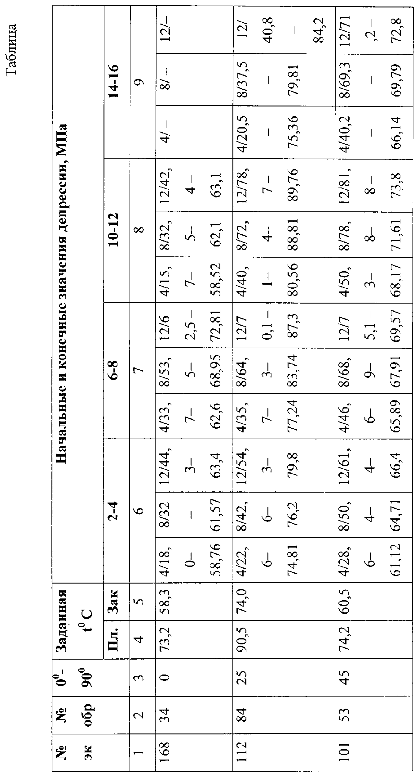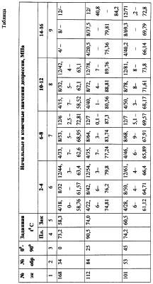 Так, например, при кольматации, закупорке образца 6 горной породы с горизонтальной ориентацией (0°) фильтрационных каналов (см. таблицу первая строка 168-34) заданная температура пласта вскрытого разреза составляла 73,2°С, а закольматированного образца 6, зарегистрированного датчиком температур 42 на выходе из камеры 2 и регистрирующим устройством (на фиг.не показано) составляла 58, 3°С. Создаем циклические депрессионные воздействия на образец 6, и в условиях деформации фильтрационных каналов увеличивается выход рабочей жидкости из образца 6 до 62,5%, что влечет за собой возрастание температуры с 58, 76°С до 72,81°С (стабилизация пластовой температуры 73,2°С), с возрастанием депрессионных воздействий происходит уменьшение выхода рабочей жидкости в 15,7% и температуры 58,52°С до полного смыкания фильтрационного канала – “-“.