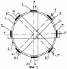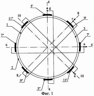 Датчик угловой скорости работает следующим образом. При отсутствии угловой скорости система первичных вибраторов 5′, 5” по оси 4-4 возбуждает колебания резонатора 1, форма радиальных колебаний которого такова, что узлы относительно пучностей отстоят на 45°.