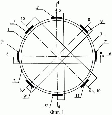 Датчик угловой скорости работает следующим образом. При отсутствии угловой скорости система вибраторов 5′, 5” по оси 4-4 возбуждает колебания резонатора 1, форма радиальных колебаний которого такова, что узлы относительно пучностей отстоят на 45°.
