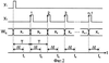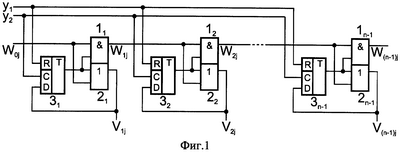 Работа предлагаемого логического вычислителя осуществляется следующим образом. На его первый, второй управляющие входы подаются соответственно импульсные сигналы y1, y2 {0,1} (фиг.2), причем период Т сигнала y2 должен удовлетворять условию T> t, где t= tТр+(n-1) tИ, а tТр и tИ есть длительности задержек, вносимых D-триггером и элементом И. Синхронно с передним фронтом импульса сигнала y1 и передними фронтами первого, …, (n-1)-го импульсов сигнала y2 на информационный вход логического вычислителя последовательно подаются двоичные сигналы х1 и х2, …, хn соответственно (фиг.2). Тогда сигналы на выходах элементов 1i, 2i будут определяться рекуррентными выражениями
