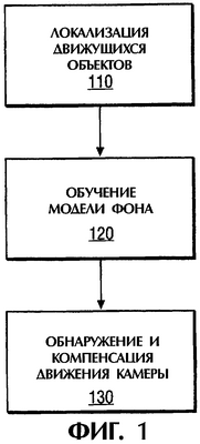 На фиг.1 показан конкретный неограничивающий вариант выполнения способа выделения фона изображения из видеопоследовательности. В одном варианте выполнения способ может включать локализацию движущихся объектов в изображении с использованием маски обнаружения изменений на стадии 110 и обучение модели фона на остальных зонах изображения на стадии 120. При локализации движущихся объектов на стадии 110 границы движущихся объектов, которые имеют однородный цвет для, по меньшей мере, двух последовательных кадров, маркируют посредством создания одной или нескольких оболочек, которые охватывают зоны, соответствующие движущимся объектам. Остаток изображения рассматривается в качестве фона и используется для обучения модели фона на стадии 120. В одном варианте выполнения фон может также использоваться для обнаружения и компенсации движения камеры на стадии 130.