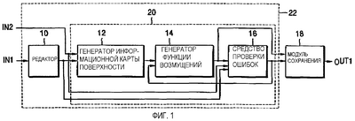 На Фиг. 1 представлена структурная схема устройства для обработки трехмерного объекта, использующего функцию возмущений, в соответствии с вариантом осуществления настоящего изобретения. В соответствии с Фиг. 1, прибор для обработки трехмерного объекта содержит редактор 10, генератор 12 информационной карты поверхности, генератор 14 функции возмущения, средство 16 проверки ошибок и модуль 18 сохранения.