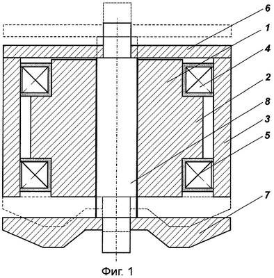 Сущность изобретения поясняется чертежами, где на фиг.1 схематически изображена профильная проекция (осевое сечение) предложенного двухпозиционного электромагнита, а на фиг.2 – его горизонтальная проекция (центральное сечение).