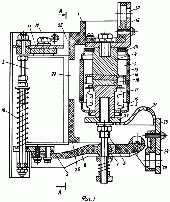 Неподвижный токоввод 4 закреплен к изоляционному корпусу 1 через Г-образную шину 19 и для внешнего болтового соединения в ней выполнены отверстия 20. Подвижный токоввод 5 имеет гибкую связь 21 с шинами 22 и 23. Поворотный рычаг 8 имеет ось вращения 24, которая расположена в изоляционном корпусе 1. Последний выполнен с перемычками 25, 26, которые перекрывают токовводы 4, 5 соответственно от взаимодействия с электромагнитным приводом 8 и образуют отверстие 27 для теплообмена камеры 3.