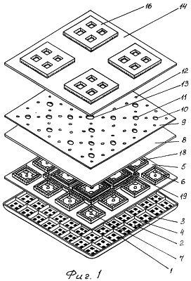 На фиг.1 изображена плоская антенная решетка без корпуса, выполненная согласно изобретению в прямоугольной изометрической проекции;