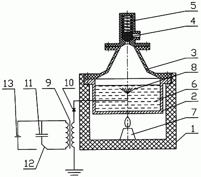 Осуществление заявляемого способа производится при помощи устройства, представленного на чертеже. Устройство содержит корпус 1 из диэлектрического материала, корпус 2 из металла, крышку 3 из диэлектрического материала. Выходное отверстие из крышки 3 перекрывается золотником 4 клапана 5. Внутри корпуса 2 находится проводящая жидкость 6, которая может быть нагрета нагревателем 7, а также электрод 8, подключенный к вторичной обмотке трансформатора 9 через диод 10. Первичная обмотка трансформатора 9 может быть подключена к конденсатору 11 при помощи выключателя 12, которым конденсатор 11 может быть подключен к источнику тока 13.