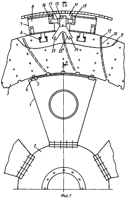 В нижней части держателя 13 выполнен проем дня сохранения внешней кромки 12 лопатки 10 на заданном расчетном уровне для обеспечения напорного вентиляционного эффекта, что придает держателю новое конструктивное формообразование в виде подковы.