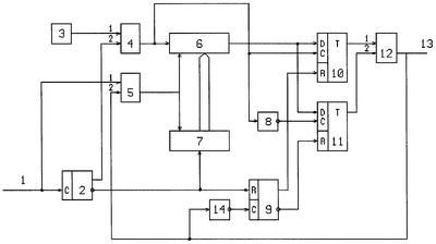 На чертеже приведена структурная схема генератора прямоугольных импульсов, где 1 – входная шина, 2 – первый триггер, 3 – генератор опорной частоты, 4 – элемент И, 5 – первый элемент ИЛИ, 6 – счетчик импульсов, 7 – программное устройство, 8 – первый элемент НЕ, 9, 10, 11 – второй, третий и четвертый триггеры, 12 – второй элемент ИЛИ, 13 – выходная шина, 14 – второй элемент НЕ.