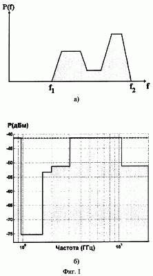 На фиг.1 приведены иллюстративные примеры формы огибающей спектральной плотности мощности хаотического носителя информации, сформированного в соответствии с настоящим изобретением (с использованием спектральных масок).