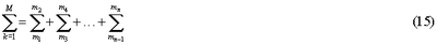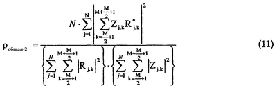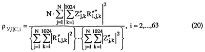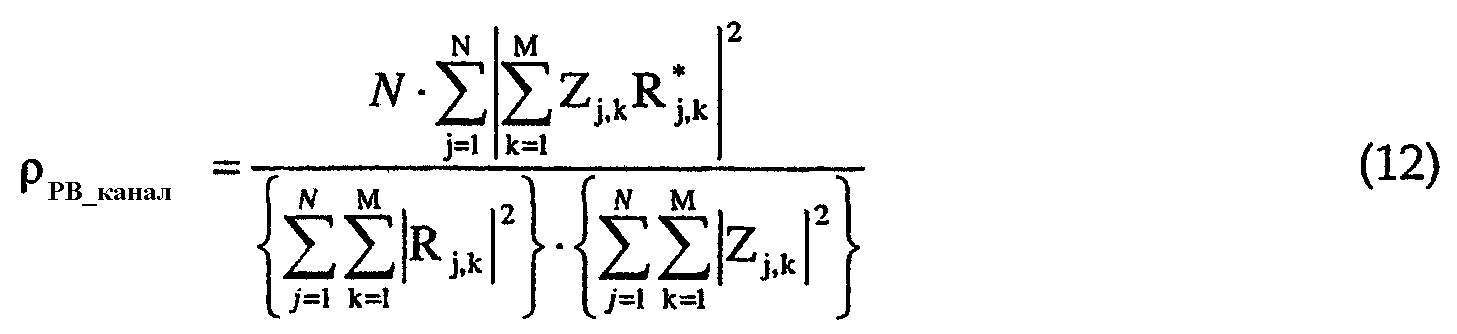 где MPB_канал,i – коэффициент кодовой области для канала с разделением по времени, идентифицированного индексом МРВ_канала, и кодового канала Ri(tk), идентифицированного индексом i, w1 – первый кодовый канал для канала МРВ с разделением по времени, wv – последний кодовый канал для канала МРВ с разделением по времени, j – индекс, обозначающий элементарный элемент форм сигнала, N – предел суммирования, обозначающий число элементарных элементов, k – индекс, обозначающий дискрету в элементарном элементе, М – предел суммирования, обозначающий число дискрет в элементарном элементе, Zj,k=z[(M(j-1)+k] – k-я дискрета в j-м элементарном элементе фильтрованного сигнала, R’i,j,k=R’i[(M(j-1)+k] – k-я дискрета в j-м элементарном элементе i-го кодового канала идеального сигнала.