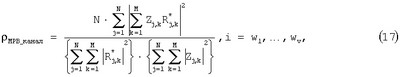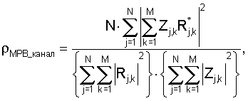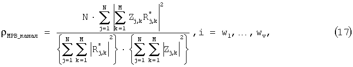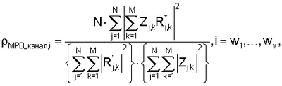 где MPB_канал,i – коэффициент кодовой области для канала МРВ_канал с разделением по времени и кодового канала i, w1 – первый кодовый канал для канала МРВ_канал с разделением по времени, wv – последний кодовый канал для канала МРВ_канал с разделением по времени, j – индекс, обозначающий элементарный элемент сигналов, N – предел суммирования, обозначающий число элементарных элементов, k – индекс, обозначающий дискрету в элементарном элементе, М – предел суммирования, обозначающий число дискрет в элементарном элементе, Zj,k=z[(M(j-1)+k] – k-я дискрета в j-м элементарном элементе фильтрованного сигнала, и R’i,j,k=R’i[(M(j-1)+k] – k-я дискрета в j-м элементарном элементе i-го кодового канала идеального сигнала.