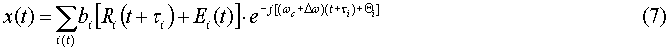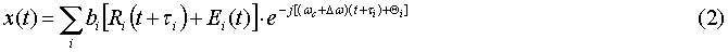 где bi – амплитуда идеальной формы сигнала относительно идеальной формы сигнала для i-го кодового канала, i – временной сдвиг идеальной формы сигнала относительно идеальной формы сигнала для i-го кодового канала,  – сдвиг круговой частоты сигнала, i – фазовый сдвиг идеальной формы сигнала относительно идеальной формы сигнала для i-го кодового канала, Ei(t) – комплексная огибающая ошибки (отклонение от идеальной формы сигнала) фактического сигнала передачи для i-го кодового канала.
