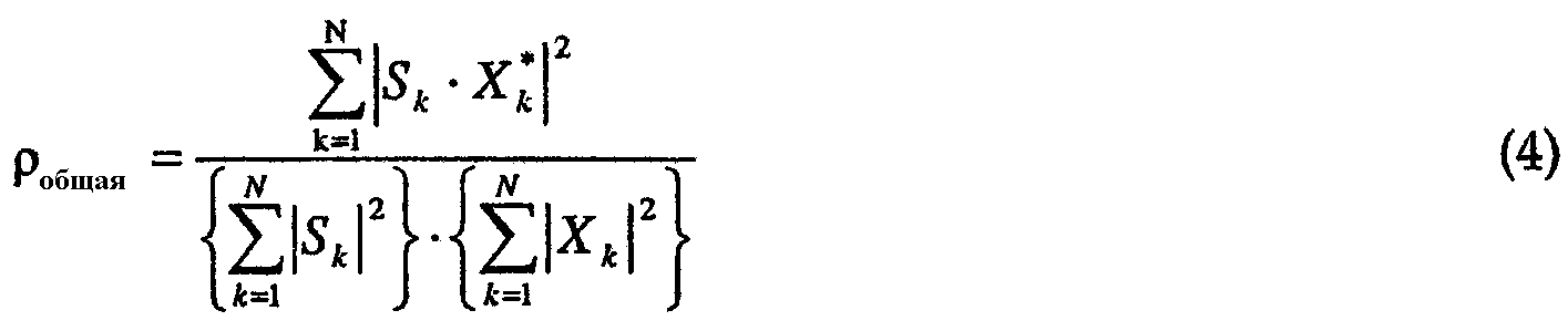 где общая-2 – вторая общая точность модуляции, j – индекс, обозначающий элементарный элемент сигналов, N – предел суммирования, обозначающий число элементарных элементов, k – индекс, обозначающий дискрету в элементарном элементе, М – предел суммирования, обозначающий число дискрет в элементарном элементе, – k-я дискрета в j-м элементарном элементе фильтрованного сигнала, и – k-я дискрета в j-м элементарном элементе идеального сигнала.