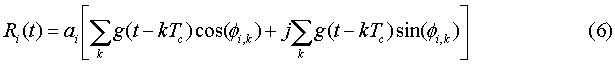 где ai – амплитуда i-го кодового канала, g(t) – единичная импульсная характеристика фильтра при передаче в основной полосе частот, i,k – фаза k-го чипа для i-го кодового канала, имеющего место в дискретный период времени tk = kTc, Tc – продолжительность чипа.