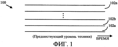 На фиг. 2 изображена такая форма сигнала 200, смоделированная на основе формы сигнала прямой линии связи вышеупомянутой системы ВСПД. Форма сигнала 200 определяется на основе фреймов 202. (На фиг. 2 показаны только фреймы 202a, 202b, 202c.) Согласно одному из вариантов осуществления, фрейм содержит 16 временных слотов 204, причем каждый временной слот 204 имеет длину 2048 чипов (“элементарных сигналов”), соответствующих длительности слота 1,67 миллисекунды и, следовательно, длительности фрейма 26,67 мс. Каждый слот 204 разделен на два полуслота 204a, 204b, при этом пилот-пакеты 206a, 206b передаются в пределах каждого полуслота 204a, 204b. Согласно одному из вариантов осуществления, каждый пилот-пакет 206a, 206b имеет длину 96 чипов и сосредоточен в середине своего связанного полуслота 204a, 204b. Пилот-пакеты 206a, 206b содержат сигнал пилот-канала, защищенный покрытием Уолша с индексом 0. Пилот-канал используется в целях синхронизации. Прямой канал 208 управления доступом к среде (УДС (MAC)) формирует два пакета 208a и два пакета 208b, каждый из которых имеет длину 64 чипа. Пакеты 208a, 208b УДС передаются непосредственно перед передачей пилот-пакетов 206a, 206b каждого слота 204 и после их передачи. Согласно одному из вариантов осуществления, УДС состоит из вплоть до 63 кодовых каналов, которые ортогонально защищены 64-ричными кодами Уолша. Каждый кодовый канал идентифицируют с помощью индекса УДС, который имеет значение между 0 и 63 и идентифицирует уникальное 64-ричное покрытие Уолша. Индексы прямого канала управления доступа к среде УДС 0 и 1 резервируют. Обратный канал управления мощностью (КУМ (RFC)) используется для регулировки мощности сигналов обратной линии связи для каждой абонентской станции. Обратный канал управления мощностью КУМ назначается одному из имеющихся УДС с индексом УДС 5-63. УДС с индексом УДС 4 используется для канала обратной активности (ОА (RA)), который выполняет управление потоком по обратному каналу трафика. Канал трафика прямой линии связи и полезная нагрузка канала управления посылаются в оставшихся частях 210a первого полуслота 204a и в оставшихся частях 210b второго полуслота 204b. Прямой канал трафика и данные канала управления кодируют, скремблируют и перемежают. По мере необходимости данные с чередованием модулируют, повторяют и перфорируют. Затем результирующие последовательности символов модуляции демультиплексируют для того, чтобы сформировать 16 пар (синфазных и со сдвигом по фазе на 90°) параллельных потоков. Каждый из параллельных потоков закрывают отдельным 16-ричным покрытием Уолша, вырабатывая различимый по кодам канал 212.