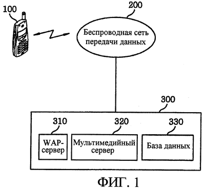 Как показано на фиг. 1, поставщик 300 содержимого содержит сервер 310 протокола беспроводных приложений (WAP-сервер) для обеспечения web-страницы, содержащей информацию о мультимедийном содержании, мультимедийный сервер 320 для предоставления выбранного содержимого в мобильный терминал 100 и базу 330 данных для сохранения мультимедийного содержимого.