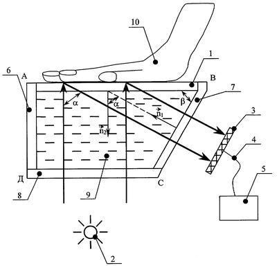 Работает заявляемое устройство следующим образом. Световой пучок (показан стрелками) от источника света 2 входит в кювету АВСД через дно 8 под углом, обеспечивающим минимальные потери (перпендикулярно), и падает, проходя через иммерсионную жидкость 9 и материал воспринимающей отпечатки ладони поверхности 1, на внешнюю (относительно кюветы АВСД) границу поверхности 1. В тех точках воспринимающей отпечатки ладони поверхности 1, которые не имеют контакта с папиллярными линиями ладони 10, свет уходит в кожу и поглощается, а в тех точках воспринимающей поверхности 1, которые имеют контакт с папиллярными линиями ладони 10, свет диффузно рассеивается и часть его выходит из материала поверхности 1 под углом полного внутреннего отражения, после чего, пройдя через иммерсионную жидкость 9, световые пучки падают перпендикулярно на боковую поверхность 7 и проходят через нее без существенных потерь, что приводит к возникновению в плоскости фотоприемных элементов 3 светотеневой картины, повторяющей линии папиллярного узора ладони. Показатель преломления иммерсионной жидкости 9 близок к показателю преломления материала воспринимающей отпечатки ладони поверхности 1, поэтому преломление и отражение светового пучка от внутренней (относительно кюветы АВСД) границы поверхности 1 пренебрежимо малы. Электрический сигнал с фотоприемников 3 через электрическую связь 4 (например, кабель) вводится в блок 5 для дальнейшей обработки.