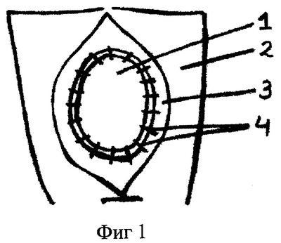 За прототип предлагаемого метода выбран предложенный в 1993 г. В.Г.Баировым способ отсроченной радикальной операции с использованием заплаты (3), суть которого заключается в следующем.