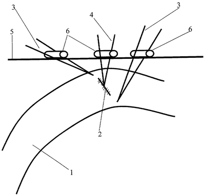 На чертеже показана перитонизация линии кишечного шва брюшиной, где 1 – кишечная петля; 2 – кишечный шов; 3 – лигатуры на линии кишечного шва; 4 – лигатура, проходящая через кишечный шов; 5 – передняя брюшная стенка; 6 – прокладки-амортизаторы.