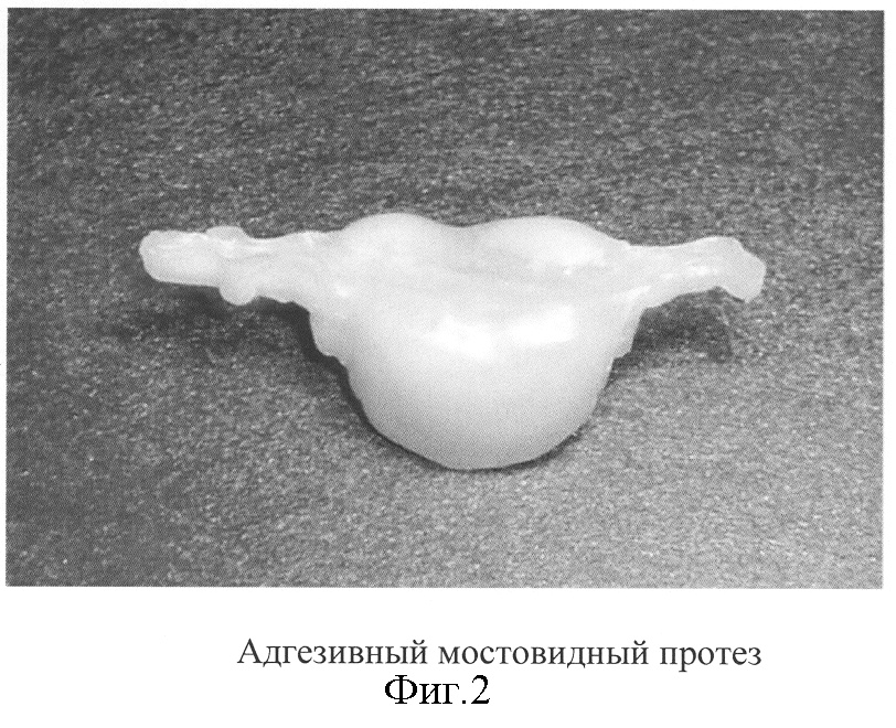 Изобретение относится к медицине, а именно к ортопедической стоматологии, и может быть использовано для изготовления адгезивных мостовидных протезов. Технический результат – увеличение силы сцепления протеза с опорными зубами. Способ осуществляется следующим образом: препарируют опорные зубы, отливают модель, дублируют ее, на продублированной модели с помощью высокопрочного гипса моделируют промывочное пространство в области дефекта. Препарированные полости на опорных зубах заполняют силиконовой массой, полимеризуют ее, срезают часть массы таким образом, чтобы она была ниже окклюзионной поверхности на 1 мм, восстанавливают полости ормокером, полимеризуют, снимают с опорных зубов и удаляют, получая накладку. Вносят неполимеризованный ормокер в полости и на гипс промывочного пространства в области дефекта слоем 0.2-0.3 мм, в него погружают половину отрезка шнура в виде петли, закрывают ормокером, накладывают другую половину шнура, накрывают слоем ормокера и прижимают сверху накладкой, излишек ормокера удаляют, осуществляют полимеризацию, моделируют промежуточную часть, снимают АМП, припасовывают и фиксируют в полости рта. 1 з.п. ф-лы, 3 ил.