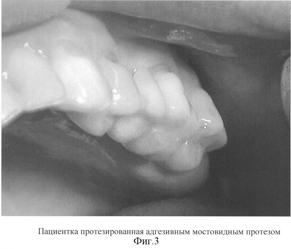 Прототипом заявляемого способа автор считает адгезивный мостовидный протез для восстановление небольших дефектов (1-2 зуба) зубного ряда, изготовленный с помощью системы “GlasSpan”, изготовленной из прочных неорганических нитей или сплетенных шнурков большого диаметра, апретированных специальным образом для прочного соединения с органической матрицей композиционных материалов. Она может быть использована для изготовления различных конструкций экстра- и внутрикоронковых шин, для восстановления небольших дефектов зубного ряда в сочетании со светоотверждаемыми композиционными материалами. (Борисенко А.В. “Композиционные пломбировочные материалы”. М., “Книга плюс”, 1999, стр.149-168).