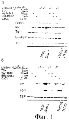 Добавление соединения по настоящему изобретению, то есть ТТА, вызывало экспрессию мРНК Inv и Tg-1 до уровней, которые значительно превосходили уровни, полученные путем обработки селективными лигандами PPAR. Эффективность ТТА как индуктора экспрессии Inv и Tg-1 была даже более заметной, когда экспрессию анализировали на уровне белка посредством вестерн-блоттинга (Фиг.1б). Следует заметить, что ТТА вызывала экспрессию мРНК Inv и Tg-1 и белка до уровней, равных или больших, чем уровни, наблюдаемые при обработке CaCl2. Взятые вместе, эти результаты говорят о том, что ТТА возможно помимо индукции экспрессии Inv и Tg-1 посредством PPAR-зависимых путей оказывала определенное влияние на экспрессию Inv и Tg-1 посредством механизмов, не связанных с функцией ТТА как лиганда PPAR и активатора.