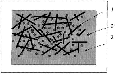 На чертеже схематично изображена биологическая прокладка для лечения пульпита. Ее структура состоит из крупнодисперсных частиц 1 биоматериала Аллоплант – стимулятора остеогенеза, мелкодисперсных частиц 2 модифицированного дентина и аморфного матрикса 3 на основе биоматериалов Аллоплант – стимуляторов васкулогенеза и фагоцитоза. Стимулятор остегогенеза формирует пространственную организацию с сохранением ячеистой структуры (сохраняется пространство для клеточной инвазии из пульпы зуба). Аморфный матрикс выполняет две функции: это субстрат для миграции клеток и метаболический материал, так как содержит протеингликаны. Модифицированный дентин является источником минеральных веществ, аминокислот и белков для синтеза одонтобластами твердых тканей зуба.