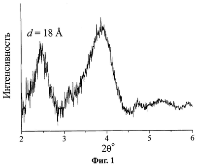Полученный катализатор превращения углеводородов, соответствующий предложенному изобретению, существенно превосходит по своим характеристикам известные катализаторы, а именно имеет удельную поверхность 600-650 м /г и суммарный объем пор 0,5-0,6 см3/г. Химический состав в мольном отношении равен 1 ZrO2:(0,1-1,0)SiO2(Ab2О3):(0,01-0,1)SO4 2-:(0,0005-0,05) металл VIII группы. Рентгенограмму катализатора характеризует наличие рефлекса, соответствующего межплоскостному расстоянию (Фиг.1), что указывает на формирование структурированной мезопористой фазы. Данный рефлекс сохраняется после прокаливания при 550-600°С, что свидетельствует о сохранности мезопористой структуры. Средний диаметр пор заявляемого материала составляет (Фиг.2).