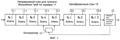 На Фиг.1 ссылочное обозначение 11 показывает непрерывный стан для прокатки бесшовных труб на оправке, в котором клети (111-115) №№1-5 расположены последовательно, при этом направления обжатия в соседних клетях изменены на 90°, ссылочное обозначение 12 указывает калибровочный стан с клетями (121-1212) №№1-12. На выходной стороне клети №12 (1212) этого калибровочного стана 12 установлен измеритель 13 толщины горячей стенки, имеющий 8 измерительных каналов по окружности.