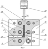 Детали 16 и 17 выполнены в виде пластин с толщиной S, равной размеру М сторон входного 20 и выходного 21 каналов. Между собой детали 16 и 17 соединены через детали 18 и 19. При этом стенки входного 20 и выходного 21 каналов образованы двумя пересекающимися плоскостями Н и П детали 16 и расположенными напротив их двумя пересекающимися плоскостями С и Т детали 17, а также частью плоскости У детали 18 и частью плоскости Ф детали 19, которые расположены напротив друг друга. Пресс-штемпель 22 введен в верхнюю часть входного канала 20.