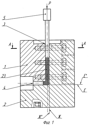 Штамп (см. фиг.1 и 2, вариант 1 исполнения 1) содержит узел деформирования, состоящий из нескольких деталей, а именно из двух деталей 1 и 2. Пересекающиеся плоскости Е и Ж детали 1 сопряжены с пересекающимися плоскостями Е1 и Ж1 детали 2. В детали 1 на пересекающихся плоскостях Е и Ж выполнены пазы, которые вместе с частями поверхностей Е1 и Ж1 детали 2 образуют входной 3 и выходной 4 каналы одинакового поперечного прямоугольного сечения. Детали 1 и 2 соединены друг с другом крепежными элементами (болтами). Пресс-штемпель 5 введен в верхнюю часть входного канала 3.