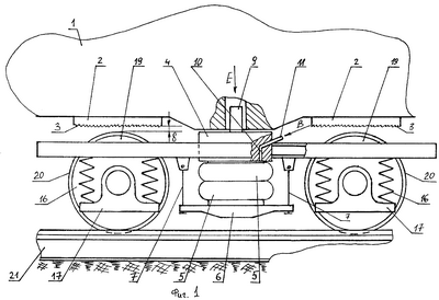 Рельсовое транспортное средство состоит из кузова 1, на днище которого установлены дугообразной формы накладки 2 с насечкой 3. Кузов 1 оперт на надрессорную балку 4, расположенную на пневмобаллонах 5, причем последние закреплены на подлюлечных балочках 6, связанных с люлечными подвесками 7, шарнирно присоединенными к раме тележки 8. Надрессорная балка 4 с помощью шкворня 9 соединена с кузовом 1, и в ней выполнен канал 10, с одной стороны связанный трубопроводом 11 с запасным резервуаром 12 пневмотормозной системы, включающей тормозную магистраль 13, воздухораспределитель 14 и тормозной цилиндр 15. С другой стороны канал 10 соединен с пневмобаллоном 5. Рама тележки с помощью винтовых пружин 16 взаимосвязана с буксами 17, которые служат опорами осей 18 колес колесных пар 19, снабженных гребнями 20. Колеса колесных пар 19 перекатываются по рельсам 21.