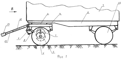 Прицеп состоит из кузова 1, установленного на раме 2, которая с помощью поворотного круга 3 связана с подкатной тележкой 4. Подкатная тележка 4 снабжена колесами 5, в которых встроены тормозные барабаны 6 и к ним примыкает балансирный вал 7, снабженный тягой 8, связанной с рычагом 9. Последний соединен с тягой 10, присоединенной к цилиндрическому стержню 11. Стержень 11 расположен подвижно в отверстии 12, выполненном в сцепной петле 13, подпружинен относительно ее пружиной сжатия 14 и одним своим концом соединен с пластиной 15, подвижно установленной в пазах 16, а другим, при помощи пальца 17, с вилкой 18 двуплечего рычага 19, который с помощью шарнира 20 установлен на дышле 21 подкатной тележки 4. К дышлу 21 жестко присоединена сцепная петля 13, а рама 2 снабжена задними колесами 22.