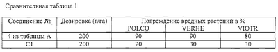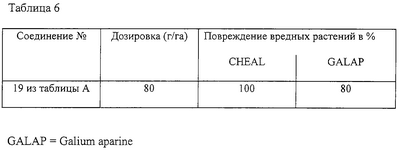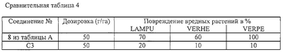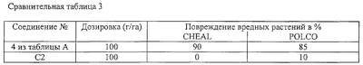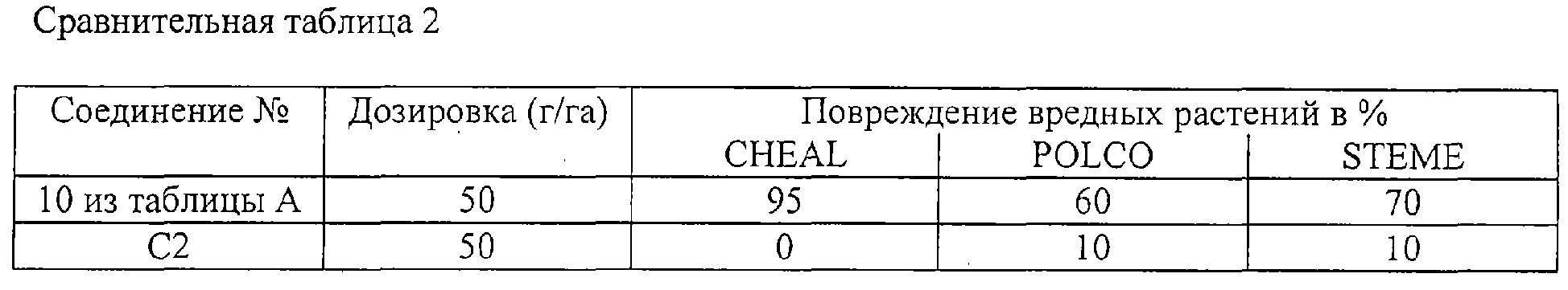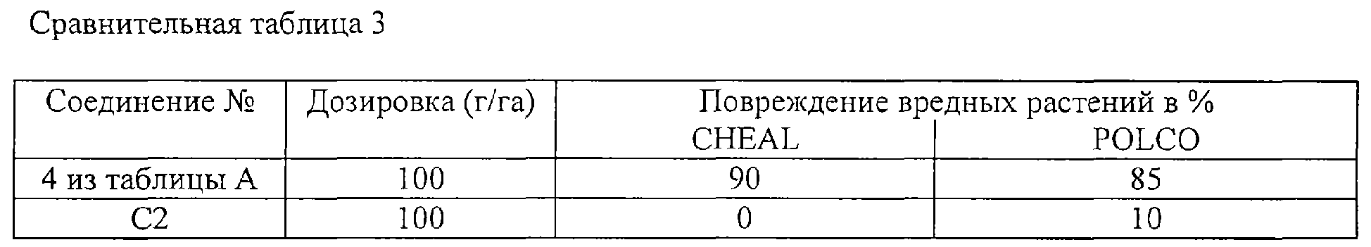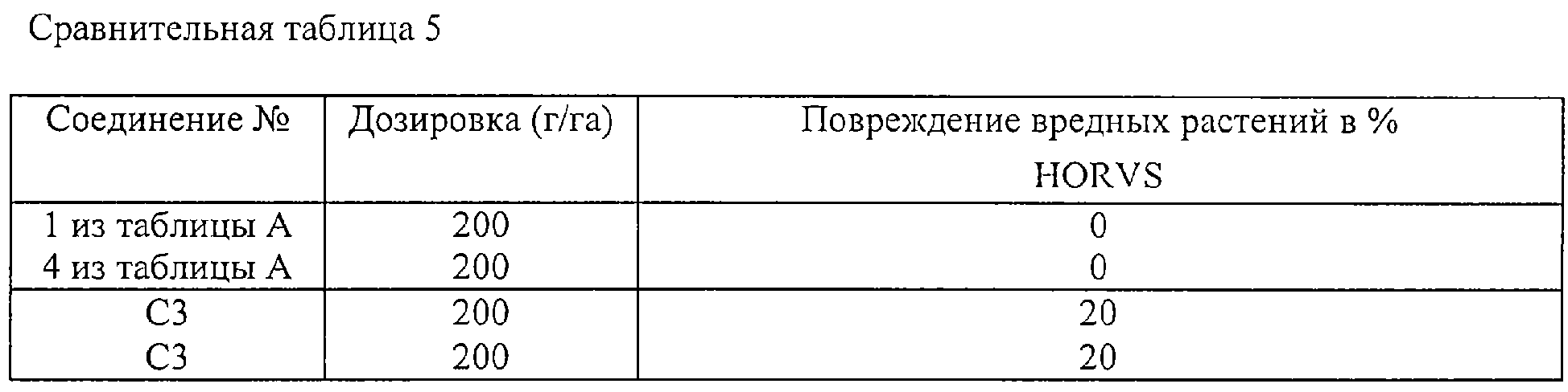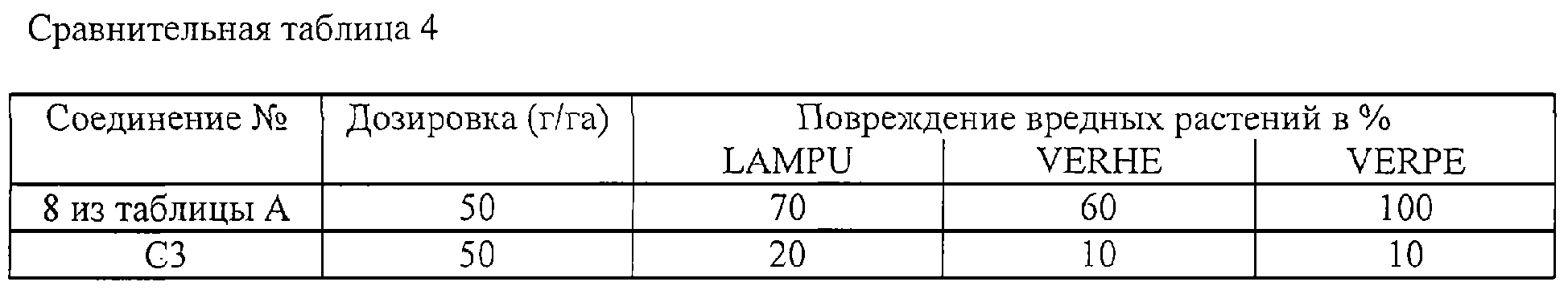 Семена одно- и двудольных вредных растений укладывались в картонные горшки в песчанистый суглинок, присыпались землей и выращивались в теплице при хороших условиях для роста. Спустя 2-3 недели после посева опытные растения обрабатывали на стадии трех листьев. Соединения согласно изобретению, включенные в рецептуру в виде распыляемого порошка или эмульсионного концентрата, распыляются на поверхность зеленых частей растений с использованием воды в количестве от 600 до 800 л/га в дозировках, указанных в таблицах 1-5. Спустя 3-4 недели выдерживания опытных растений в теплице при оптимальных условиях для роста оценивается воздействие соединений согласно данному изобретению по сравнению с известными соединениями. Как показывают результаты сравнительных таблиц 1-4, выбранные соединения согласно данному изобретению проявляют лучшую гербицидную активность по отношению к широкому спектру экономически важных одно- и двудольных вредных растений по сравнению с известными на данный момент гербицидными средствами.