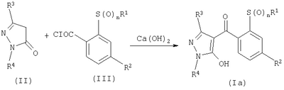 Необходимые соединения, используемые в вышеприведенных схемах, являются либо продаваемыми продуктами, либо веществами, синтезируемыми по известным методам. Так пиразолоны формулы (II) можно, например, получить по методикам, описанным в ЕР-А 0240001 и Дж. Практ. Кем. (J. Prakt. Chem.) 315, 382 (1973), а бензоилхлориды формулы (III) – по методикам, описанным в ЕР-А 0527036.